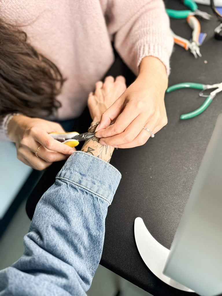 Permanent jewelry is a custom, jewelry-welding process where we seamlessly connect bracelets, anklets, rings, or necklaces directly to your body, creating a unique and personal piece of art that you can wear every day. No clasps, no fuss—just a beautiful, timeless piece that moves with you.