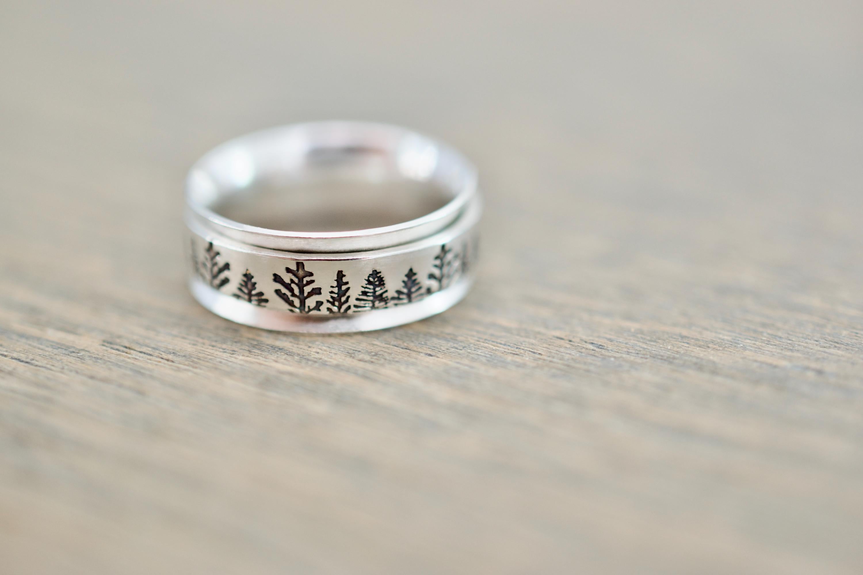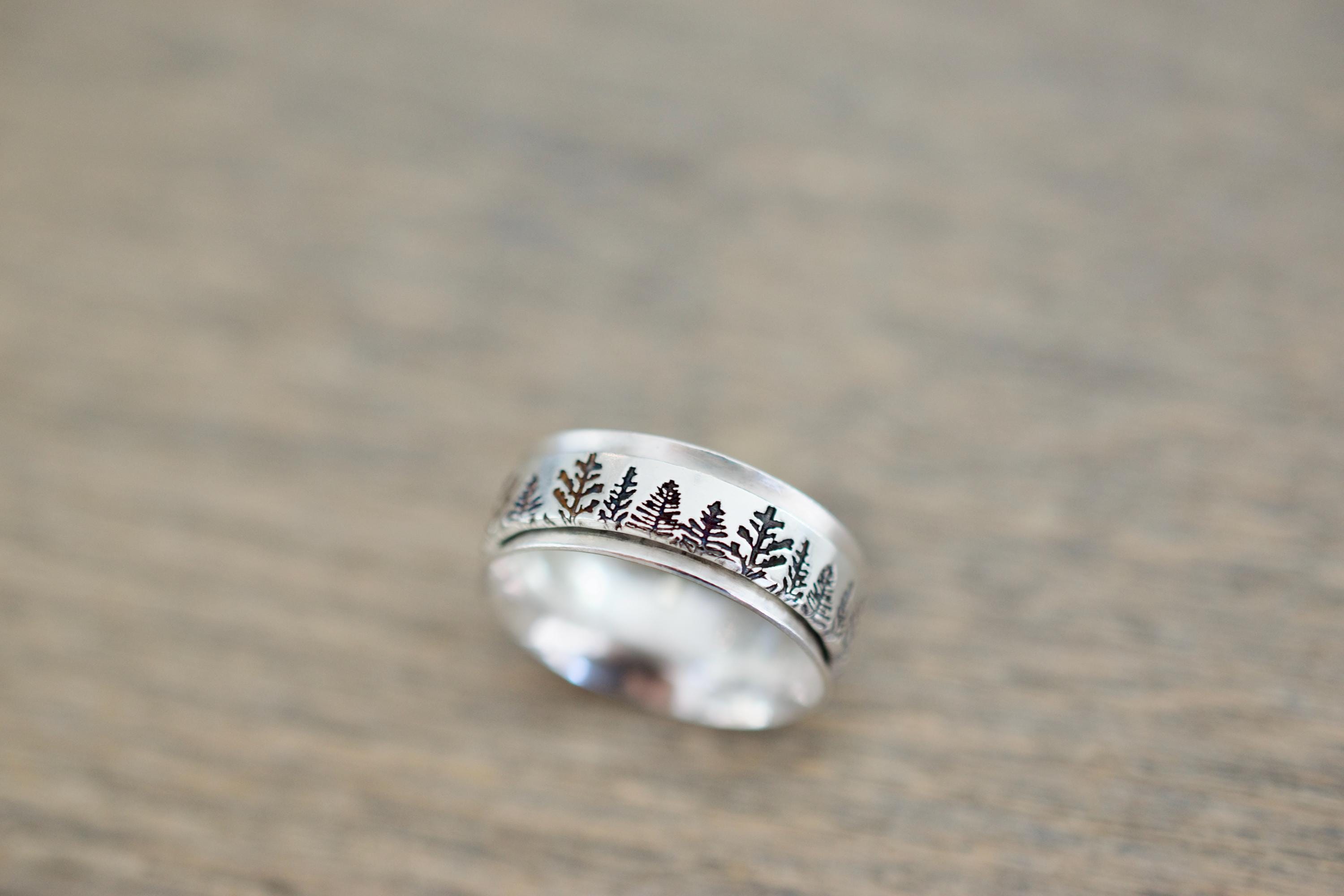 - Design: Sterling silver spinner ring with a concave (gently scooped inward) outer band and a freely spinning inner band stamped. Forest design is all the way around the ring.